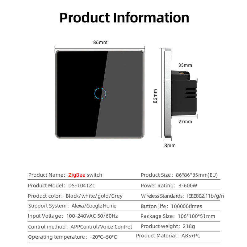 Zigbee Smart Touch Light Switch With Metal Frame